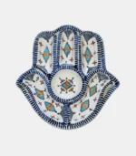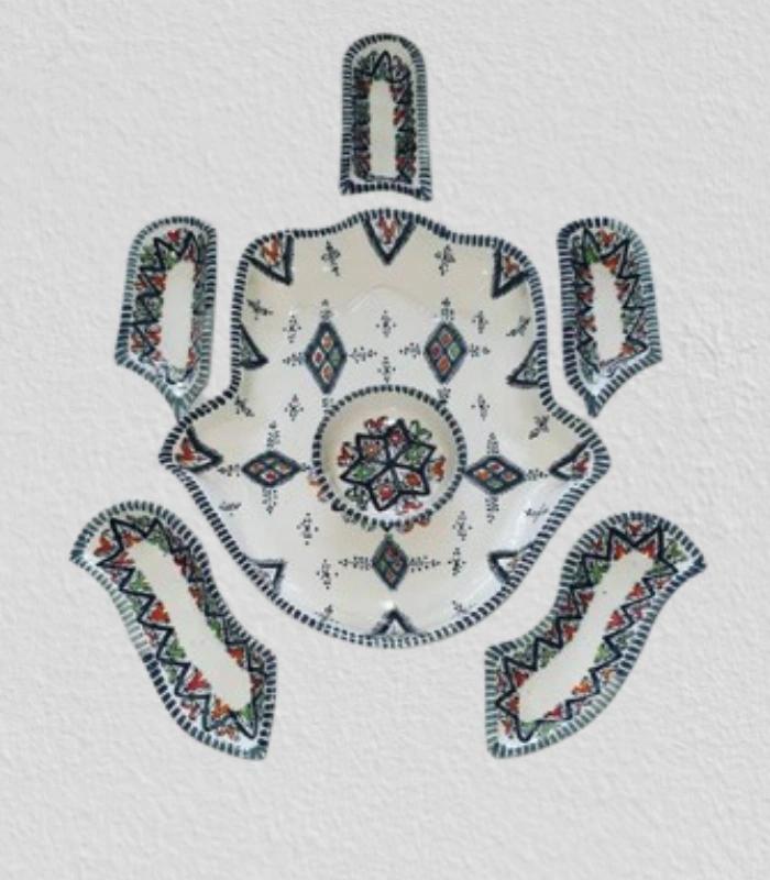 This unique ceramic set, shaped in the iconic Hand of Fatima, showcases the artistry of Moroccan craftsmen. Originating from Safi, renowned for its pottery, each piece is meticulously hand-painted with vibrant colors like turquoise, amber, and coral, reflecting the expertise of local artisans.