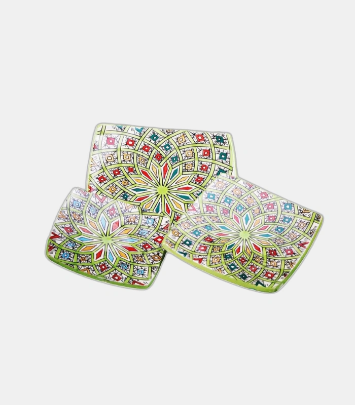 Vibrant colors like deep blue, rich red, and sunny yellow add a touch of energy, while creamy white introduces an element of pure elegance. The harmonious blend of colors makes each plate a captivating addition to any dining experience.