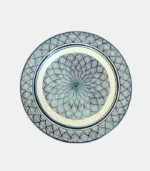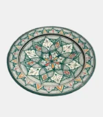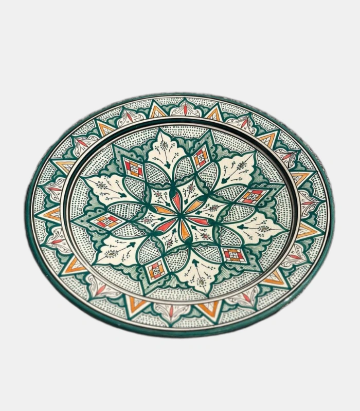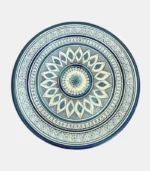 This circular dish is a true work of art, showcasing the intricate beauty of Moroccan craftsmanship. Its geometric design, along with overlapping plant motifs, adds a luxurious touch to any table setting. The vibrant central pattern, resembling a flower or star, contrasts beautifully with the creamy white background, while dark blue accents highlight the detailed embossing.