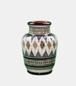 This traditional Moroccan ceramic vase reflects the skill and passion of the artisans of Safi. With its classic design, featuring a short neck and gently rounded body, the vase is decorated with intricate patterns in shades of dark green, red, yellow, white, and black on a soft white background.